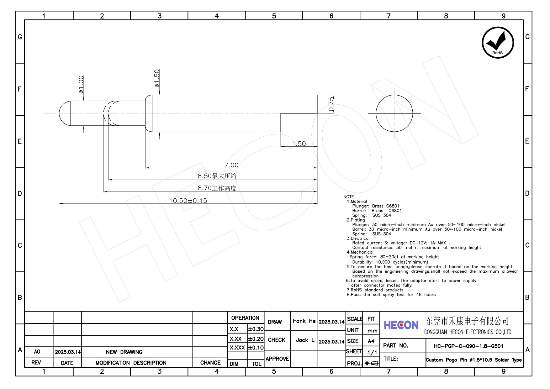 PIN Plating: | Gold Flash 3U” | Spring Force: | 80g±20g or Customized |